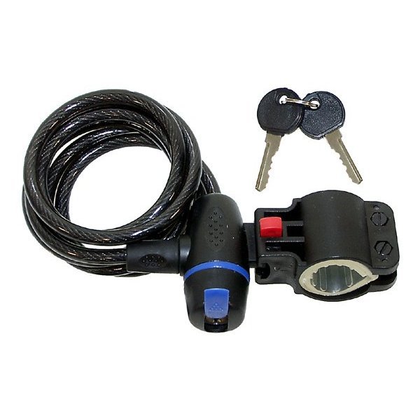 Замок велосипедный M-Wave, длина 1500 мм, толщина троса 8 мм, механизм с ключом, с креплением на раму, прозрачный пластик.