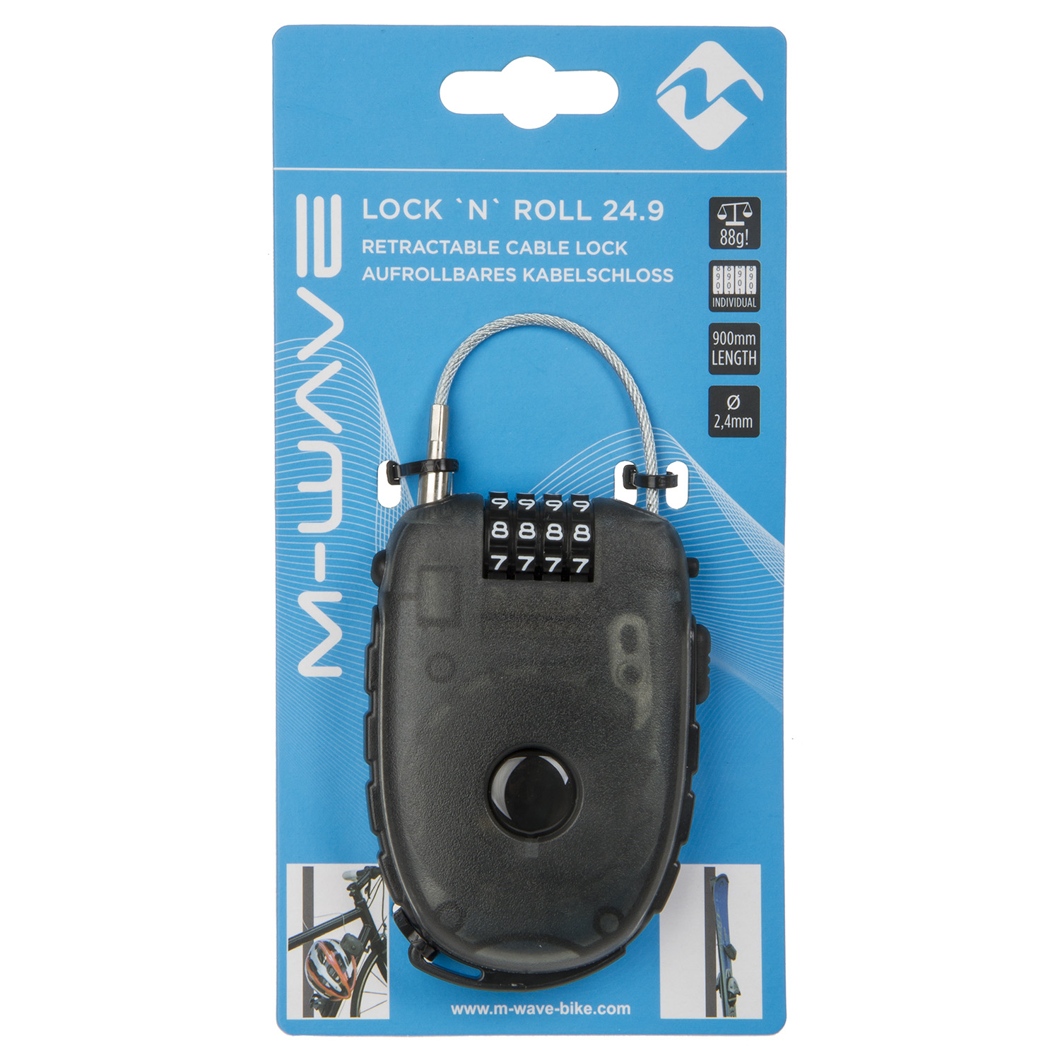 Велозамок M-Wave Lock 'N 'Roll D 24.9 Multifunctional Lock, кодовый механизм, стальной трос 2.4mm, многофункциональный, вес 88 грамм.