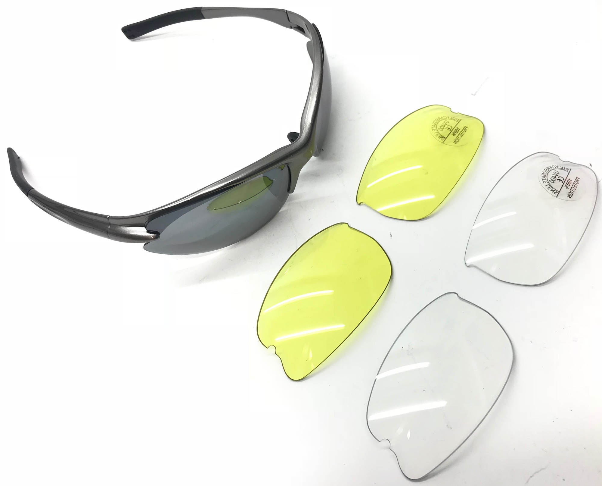 Очки велосипедные KINDAVID S11765. Цвет оправы - серебро. Линзы - поликарбонат, UV-защита. Три сменные линзы в комплекте: дымчатый, жёлтый, прозрачный. Силиконовая переносица, силиконовые дужки.