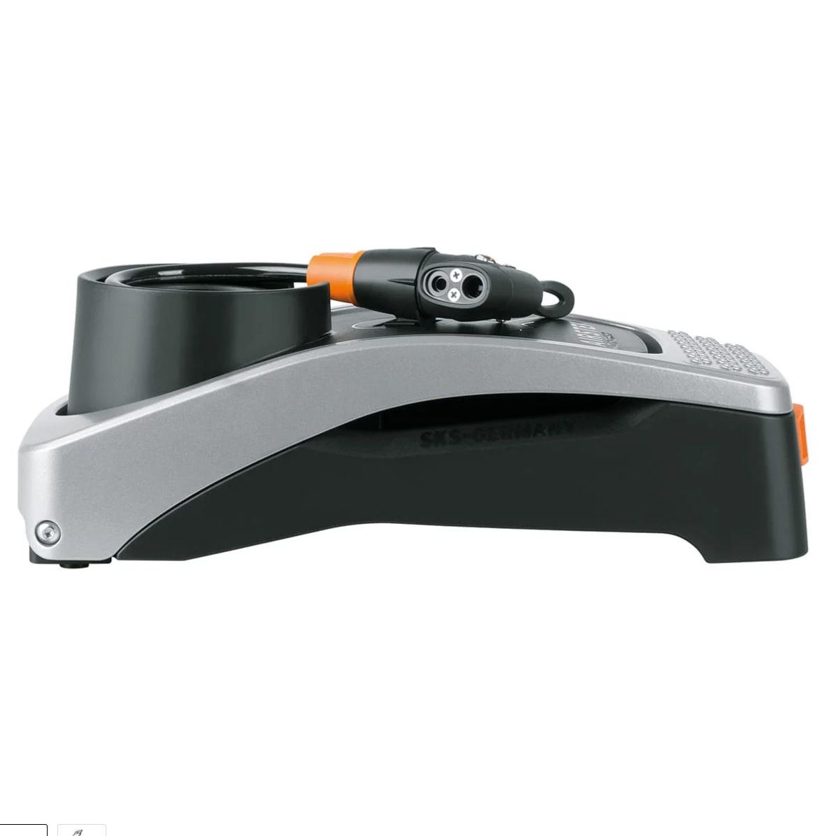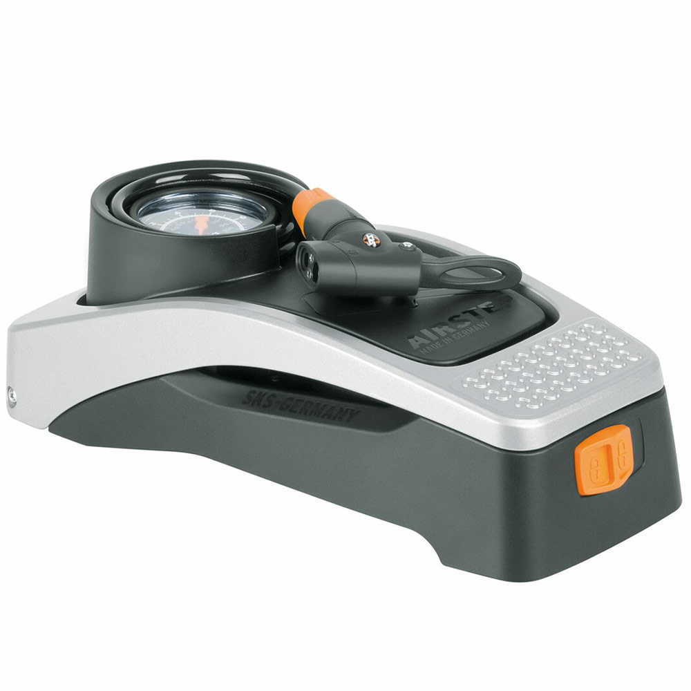 Насос ножной SKS Airstep, алюминиевая ножная педаль, надежный механизм, большой и легко читаемый манометр, универсальный клапан для любых ниппелей (AV, SV, DV), максимальное давление 7 атмосфер / 102 PSI, в сложенном состоянии насос имеет очень компактные размеры.