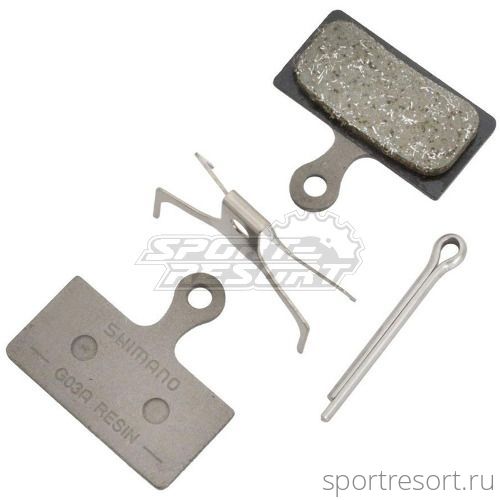 Тормозные колодки Shimano G03A Resin Pad, состав полимер, с пружинкой и шплинтом, подходит для дисковых тормозов Shimano XTR/XT/SLX/Alfine BR-M985, BR-M785, BR-M666, BR-M675, BR-S700.