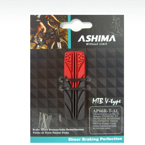 Тормозные картриджи Ashima AP66R-H-AL, длина 72 мм, трех компонентные, первая часть предотвращает скрип, вторая часть отводит влагу, третья часть отвечает за торможение, совместимы с Shimano XTR/DEORE XT и другими любыми тормозами V-типа.