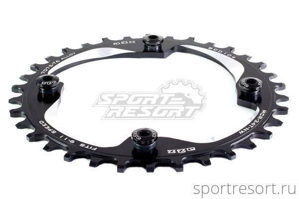 Звезда A2Z, 32T, стандарт крепления BCD 104, технология Narrow-wide (исключает спадание цепи за счет строения зубьев), материал фрезерованный 7075-T6, бонки для крепления в комплекте, цвет черный.